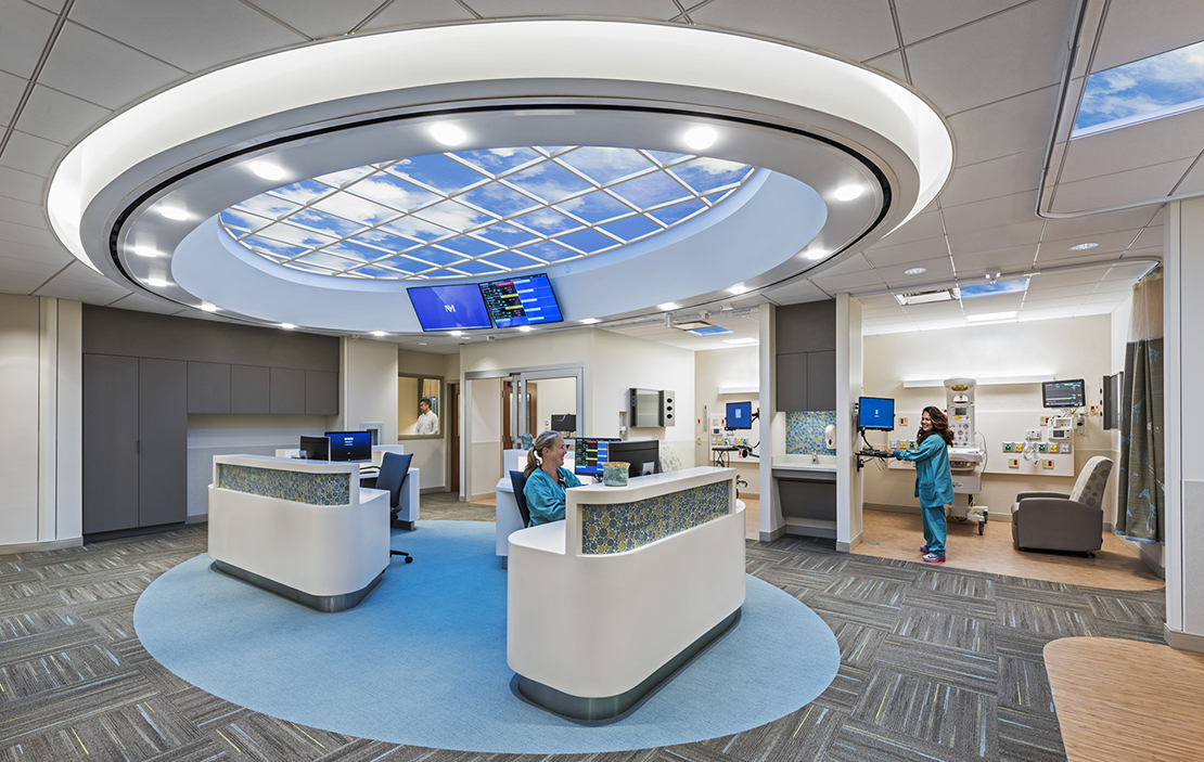 The NewLife Maternity Center at Delnor features a 10’ X 20’ elliptical virtual skylight. This custom Luminous SkyCeiling features a curving perimeter that embraces shift nurses, doctors, and all the new parents as they shuttle throughout the day from the seven special care infant bays back to the central hub.
