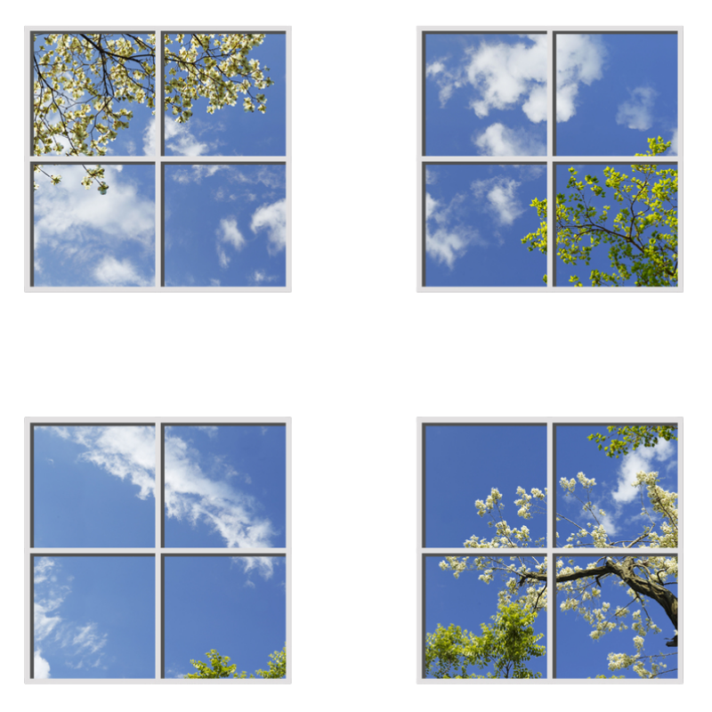 Sky Factory Split Classic Virtual SkyCeiling 6am01_2-4x16md measuring 8x16 with 2x2 tiles featuring Puffy White - Cumulus Clouds and Spring Blossoms and Foliage