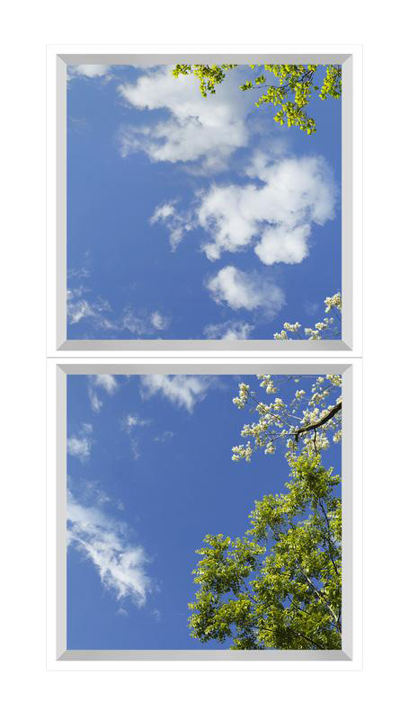 Sky Factory Rectangular Revelation Virtual SkyCeiling 6am01_4x8md01_r44 measuring 4'x8' with 4'x4' tiles featuring Puffy White - Cumulus Clouds and Spring Blossoms and Foliage.
