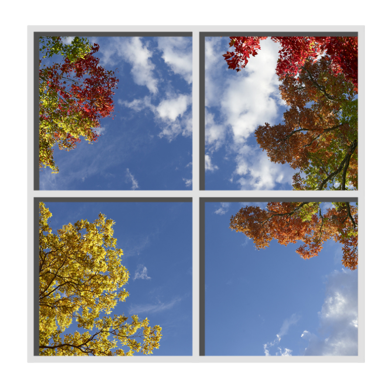 Sky Factory Split Classic Virtual SkyCeiling 6am01_8658clmd measuring 8.5' with 2'x2' tiles featuring Puffy White - Cumulus Clouds and Spring Blossoms and Foliage