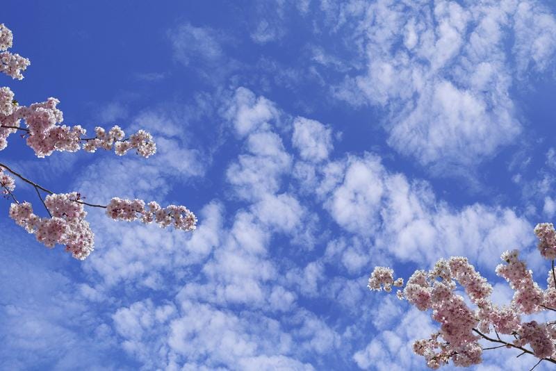 Sky Factory Virtual SkyCeiling Master Image 6am01 Featuring Puffy White Cumulus Clouds and Spring Blossoms and Foliage.
