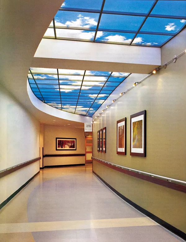 The result was a dramatic effect along the 76-foot corridor. The continuous virtual skylight invites visitors to enjoy the gallery-quality environment, which retains a distinct open ambiance, a welcome contrast to the tunnel effect that plagues so many interior hallways.