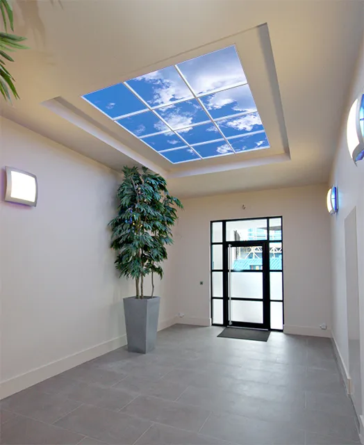 The vision of Aurient Investments Ltd’s Richard Whitehorn and Menal Mehta, and their architects, to achieve a light and open feeling in the renovated coaching entranceway was achieved by the installation of a 6’x8′ Sky Factory Luminous SkyCeiling. This stunningly realistic virtual skylight is set back into a deep soffit, drawing the eye to the open space of a sunny sky above, helping to transform the transition between interior and exterior into a delightful, illusory surprise.