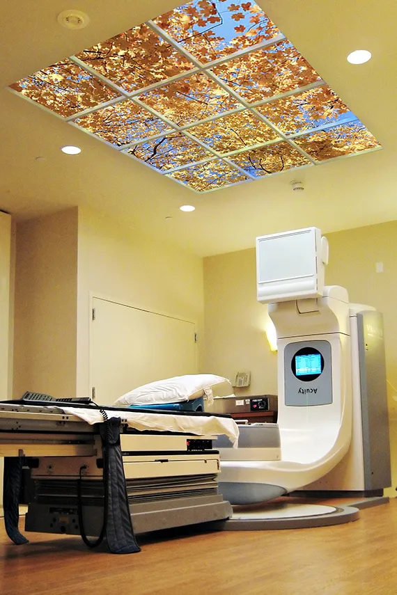 Greenwich Hospital installed two uniquely engaging Luminous SkyCeilings in the radiation treatment area of the hospital’s new addition. The 6’x8′ Rectilinear Luminous SkyCeiling features a tapestry of gold, brown, and orange Fall foliage backed by a clear blue sky. The hospital also purchased an alternate set of SkyTiles featuring a fresh Spring scene.