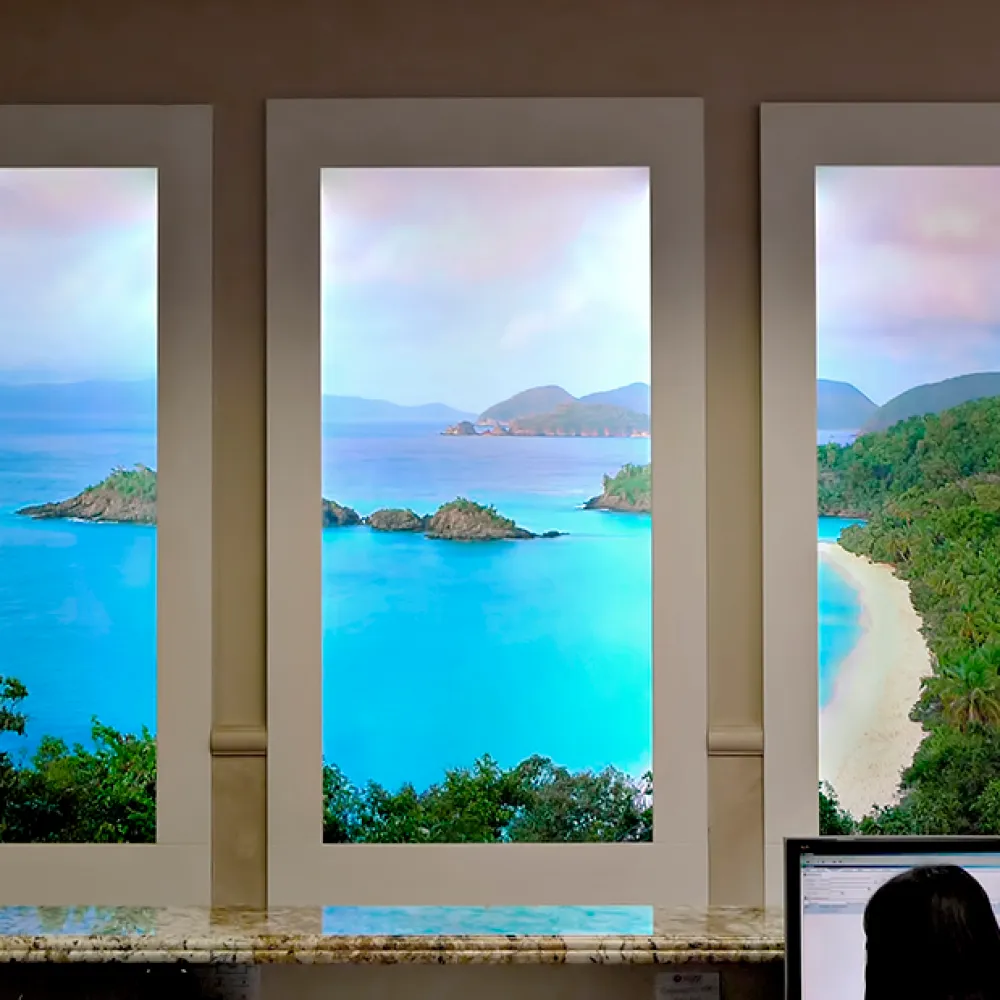The color temperature of the daylight-quality artificial light uses to illuminate the high-resolution digital photography (high CRI 6500K) and the patented elevators that recess the SkyTiles away from the rest of the ceiling create a palpable illusion of overhead skies while altering our perception of depth in enclosed interiors.