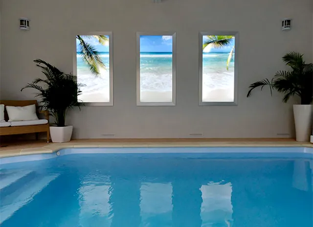 Sky Factory Luminous Virtual Windows add a sense of the tropics to the Texier’s pool area. Sky Factory’s exclusive images are scaled to give the sense of a continuous landscape viewed through separate windows.
