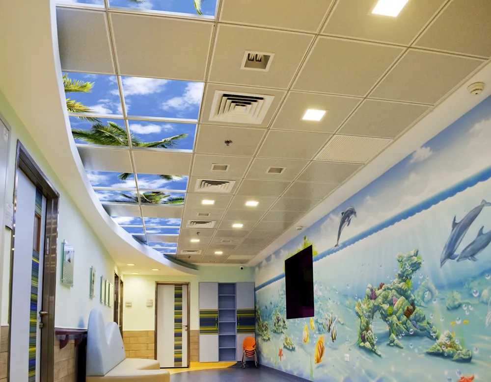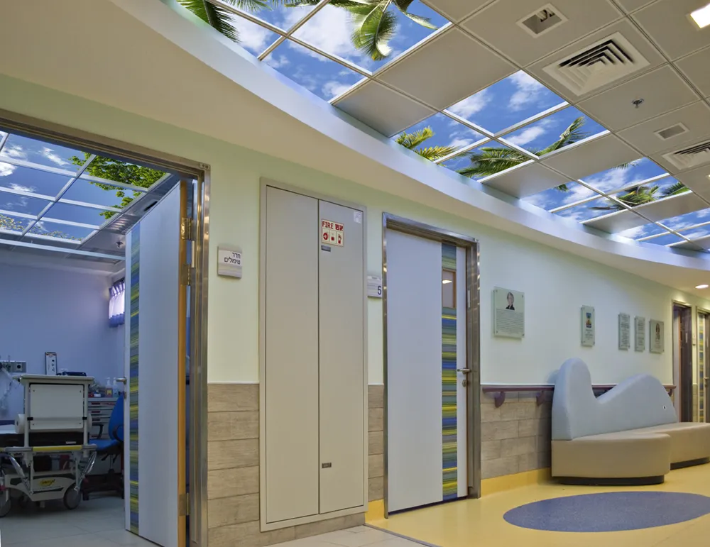 Yoseftal Medical Center is Israel’s southernmost hospital, located in the popular tourist town of Eilat. The remodeled pediatrics department was designed by architect Michal Rom, Principal at Impact Design and features our Classic Luminous Virtual SkyCeilings and eScape Digital Virtual Window. Ms Rom said of the installation, “Thanks to Sky Factory we were able to bring the optimistic view of the sky into the interior playroom space. The idea was to create the outdoors feeling of a beach in the playroom and one picture says it better than a thousand words.”